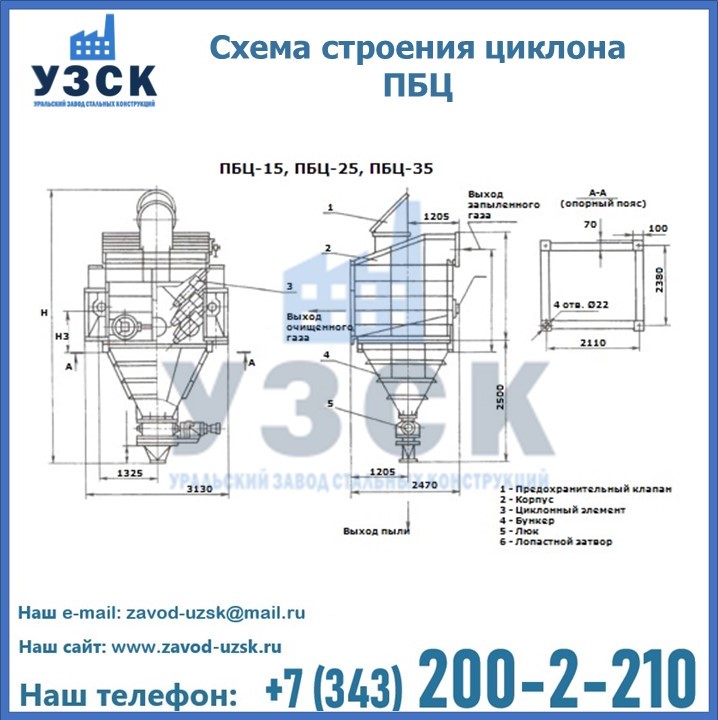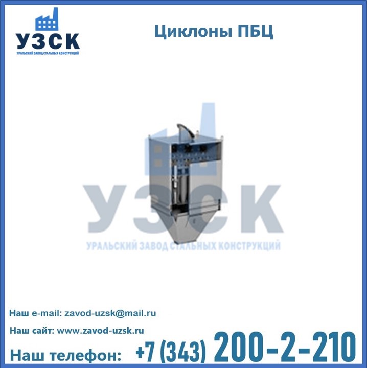 Завод «УЗСК» в Рубцовске предлагает приобрести циклоны ПБЦ и прочие устройства, полностью укомплектованные и готовые к эксплуатации. Мы гарантируем соответствие оборудования всем требованиям ГОСТ и ТУ, износостойкость и высокую производительность предлагаемого оборудования. Уральский Завод Стальных Конструкций изготавливает и продает надежное, эффективное и производительное оборудование, имеющее длительную гарантию и большой эксплуатационный ресурс. Если требуется изготовить циклон нестандартных размеров, то такой вариант выполнения заказа тоже предусмотрен, так как предприятие имеет собственные производственные площади и надежных поставщиков. На все поставляемое или производимое оборудование имеются чертежи и прочая техническая документация. Заказать и купить циклоны или прочее оборудование высокого качества и по доступной цене можно через наш сайт или по указанному в разделе «Контакты» телефону.