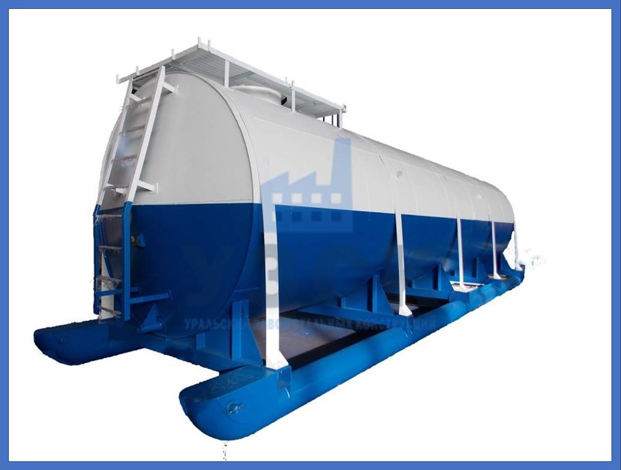 Тяжесть бака с содержимым равномерно распределяется на длинные двусторонние полозья. Изготавливаются емкости на 5-75 кубов. Большие габариты потребуют дополнительных упрочняющих конструкций, что нерационально.
