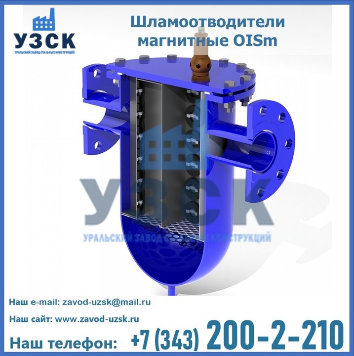 Шламоотводители магнитные OISm включает в себя цилиндрический корпус, верхняя часть которого оборудована входным и выходным патрубками. Внутри корпуса размещается съемный вкладыш, оборудованный перегородками. Нижняя часть перегородок опирается на съемную дырчатую пластину, кроме того, данные элементы оснащены плоскими магнитами. С помощью перегородок задаются направление и скорость потока среды, предназначенной для очистки. На отверстии выходного патрубка изнутри стоит сетчатый фильтр. Корпус шламоотводителя сверху закрыт плоской крышкой с воздушником. Снизу корпус оборудован шламовой камерой для отходов более крупной фракции и дренажным патрубком. Крышка корпуса, перегородки и сетчатый фильтр — это съемные элементы, благодаря чему, обеспечиваются легкость демонтажа и нетрудоемкая и тщательная очистка шламоотводителя.